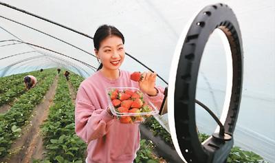農(nóng)民通過網(wǎng)絡(luò)直播銷售自家種植的草莓。孫中喆 攝(人民圖片)