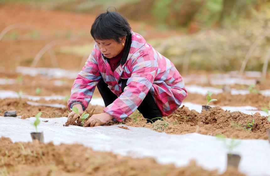 2月28日,江西省宜春市上高縣墨山鄉(xiāng)香山村蔬菜種植基地,菜農(nóng)正在種植蔬菜。近年來,在政策扶持和農(nóng)業(yè)技術(shù)支持下,該村大力發(fā)展黃土地蔬菜種植,黃瓜、苦瓜、豆角、茄子等綠色蔬菜銷往全國多地,讓當?shù)夭宿r(nóng)在家門口就業(yè)增收。