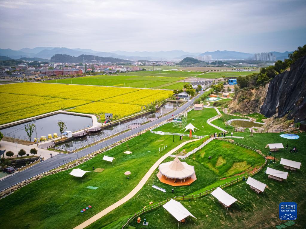 這是3月29日拍攝的諸暨市楓橋鎮(zhèn)杜黃新村用廢棄礦山改造的露營旅游地(無人機(jī)照片)。記者 江漢 攝