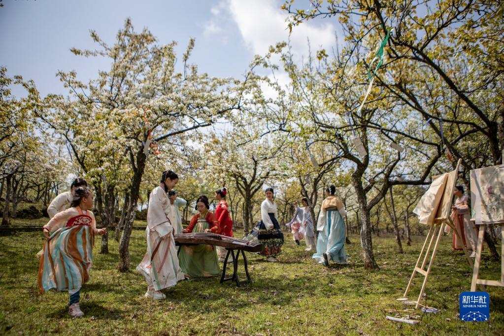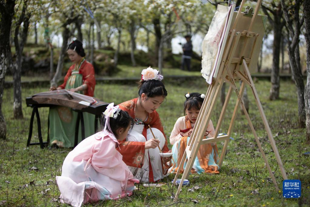 4月1日,一名古裝愛(ài)好者穿著古裝在秀山縣溶溪鎮(zhèn)梨園村梨樹(shù)下教小朋友畫(huà)畫(huà)。胡程 攝