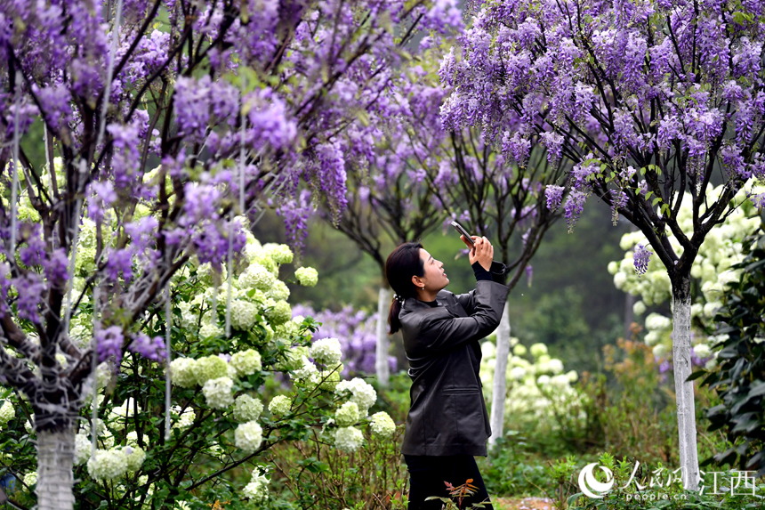 4月6日,江西省上饒市廣豐區(qū)大南鎮(zhèn)新塘的中華木繡球博覽園里游客如織,當(dāng)前,正值木繡球的盛開期,白的如雪、綠的如玉,加上紫藤、茶梅的襯托,整個(gè)博覽園顯得清新淡雅,游客們徜徉其中賞花打卡,好不自在。