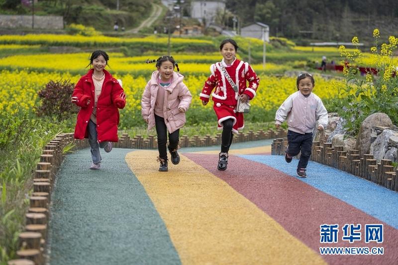 幾位孩子在湖北恩施市盛家壩鎮(zhèn)石欄村的彩虹道上奔跑。