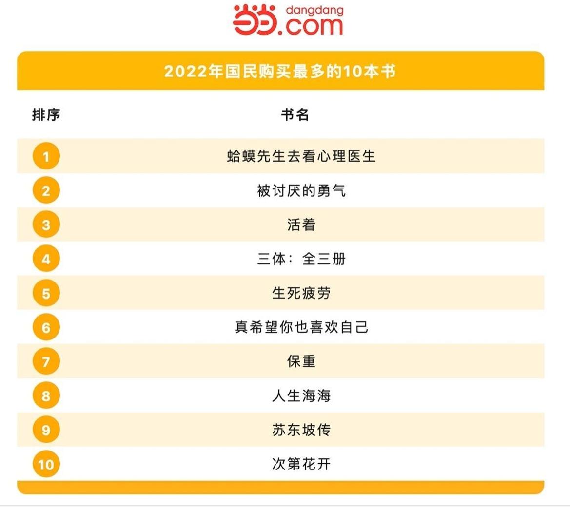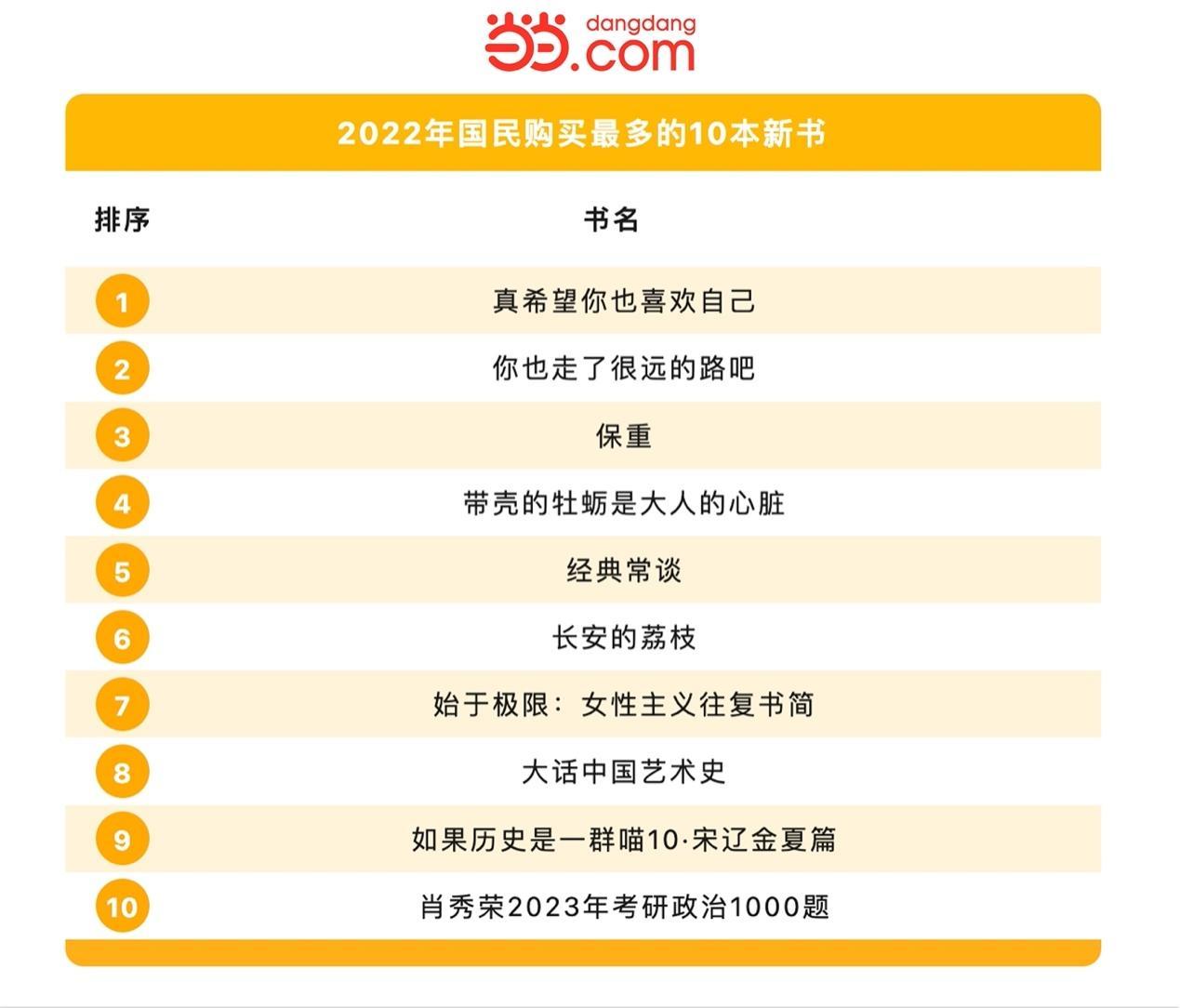 2022年國(guó)民購(gòu)買最多的10本書中,心理學(xué)、療愈類、成功勵(lì)志、嚴(yán)肅文學(xué)、科幻書籍霸榜。邊躺邊卷是年度閱讀主題,一方面讀者通過(guò)自助心理類,心靈療愈類、嚴(yán)肅文學(xué)類書籍對(duì)抗精神內(nèi)耗,尋求自洽;一方面又通過(guò)成功勵(lì)志類、科幻類等書籍尋求積極、振奮的心態(tài)。