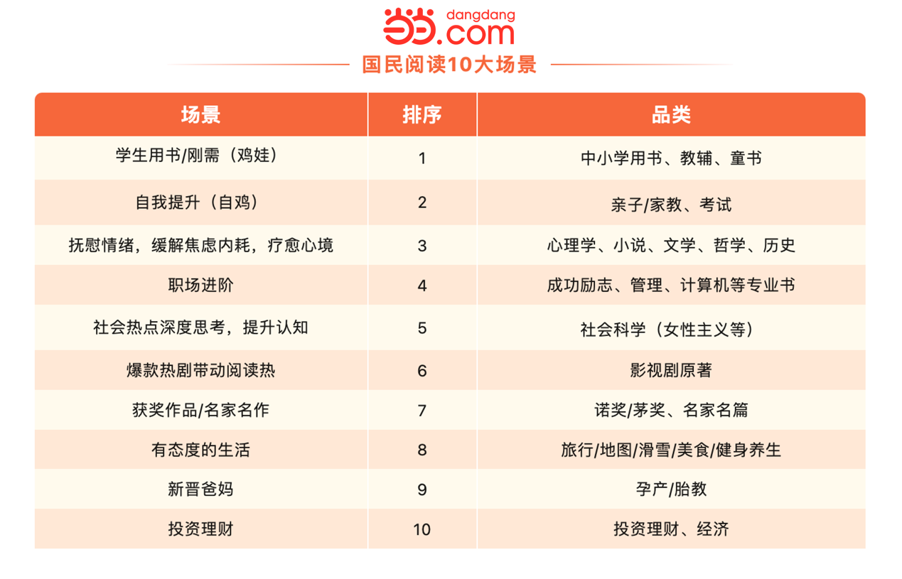 閱讀是大腦的有氧運(yùn)動(dòng),卻自帶阻力。在現(xiàn)實(shí)生活中,想不起來(lái)閱讀,想起來(lái)閱讀不知道讀什么書,是當(dāng)下閱讀推廣面臨的主要問(wèn)題。結(jié)合品類和爆款書的消費(fèi)趨勢(shì),當(dāng)當(dāng)網(wǎng)發(fā)布“國(guó)民閱讀10大場(chǎng)景”,以期提醒更多讀者想起閱讀,想起書。