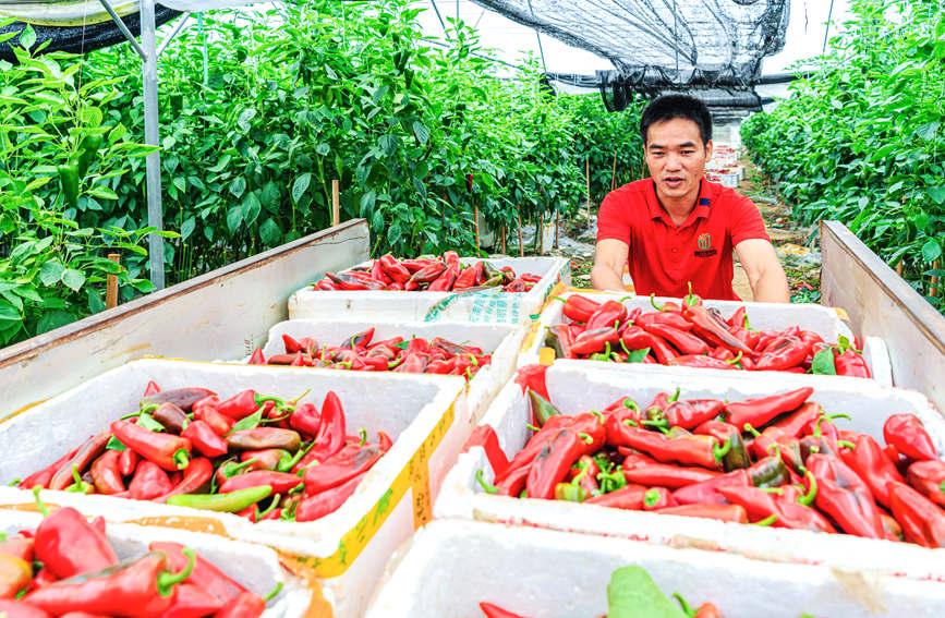 時(shí)下,廣西壯族自治區(qū)合浦縣常樂(lè)鎮(zhèn)西城村的140多畝的彩椒產(chǎn)業(yè)基地迎來(lái)豐收,紅燦燦的彩椒掛滿枝頭,數(shù)十名工人來(lái)回穿梭進(jìn)行采摘、搬運(yùn)、裝車再運(yùn)送到收集點(diǎn),一派繁忙景象。