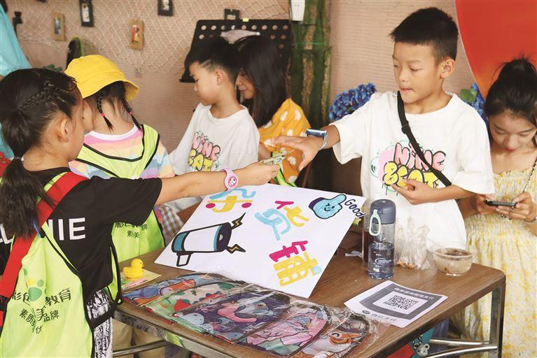 活動(dòng)現(xiàn)場(chǎng),30多名“小賣手”吆喝著售賣漫畫作品、涼粉、米蟲(chóng)、涼粽、南瓜花、西紅柿、豆腐釀等,忙得不亦樂(lè)乎。