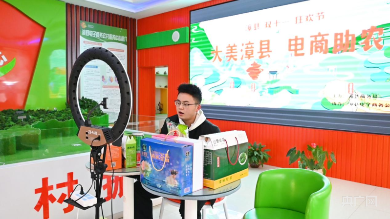 貨架上沙棘果汁、土蜂蜜、羊肚菌、雜糧、中藥材等琳瑯滿目的農(nóng)特產(chǎn)品擺放得整整齊齊,甘肅省定西市漳縣電子商務(wù)公共服務(wù)中心的工作人員漆隨棟正在網(wǎng)上直播賣貨。