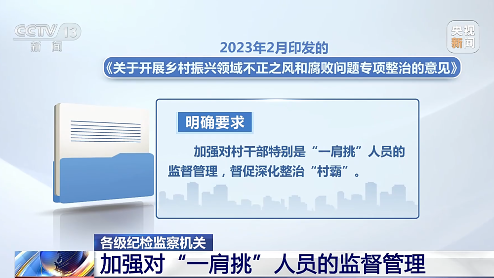 今年2月印發(fā)的《關(guān)于開(kāi)展鄉(xiāng)村振興領(lǐng)域不正之風(fēng)和腐敗問(wèn)題專(zhuān)項(xiàng)整治的意見(jiàn)》就明確要求,加強(qiáng)對(duì)村干部特別是“一肩挑”人員的監(jiān)督管理,督促深化整治“村霸”。