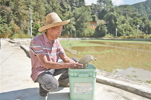 10月25日,在廣西壯族自治區(qū)賀州市昭平縣走馬鎮(zhèn)走馬村的甲魚養(yǎng)殖基地,平靜的池面下,不時可見甲魚探出頭來。時值深秋,早晚溫差大,接近正午,基地管理員盧火生開始了一天的工作。他告訴記者:“現(xiàn)階段最主要的就是喂食,每天一次,春夏季節(jié)是上午7時左右投料,秋冬季節(jié)一般是中午13時?!?/span>