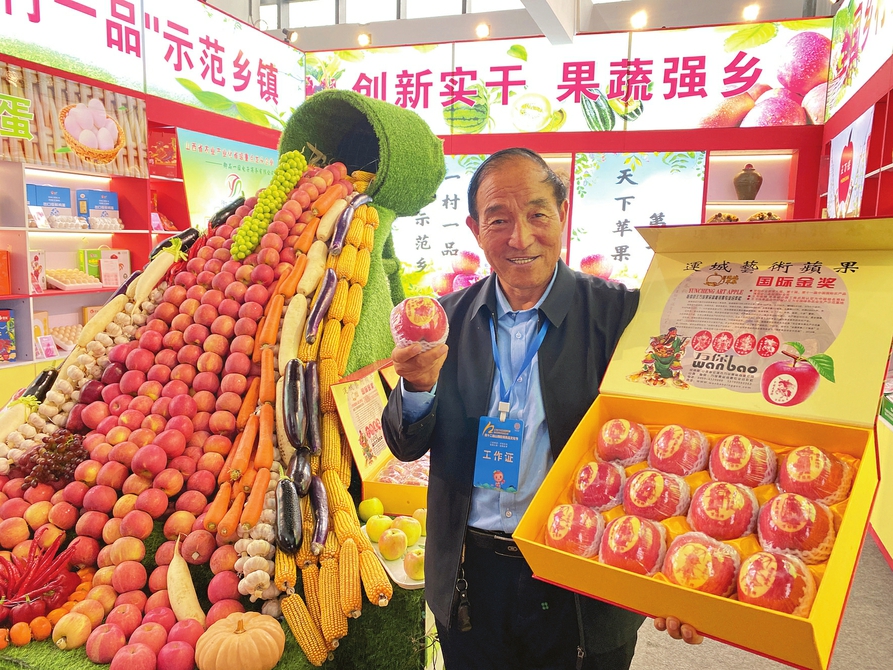 社長(zhǎng)王萬(wàn)保在展示合作社文化藝術(shù)蘋果 張新征 攝