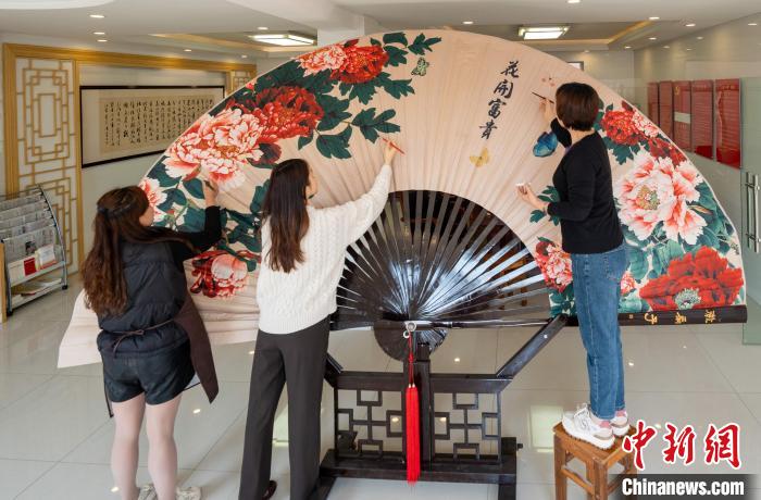 5月14日,工作人員正在專門定制的長2米,寬3.8米的大號竹扇上繪制圖案 王歌 攝
