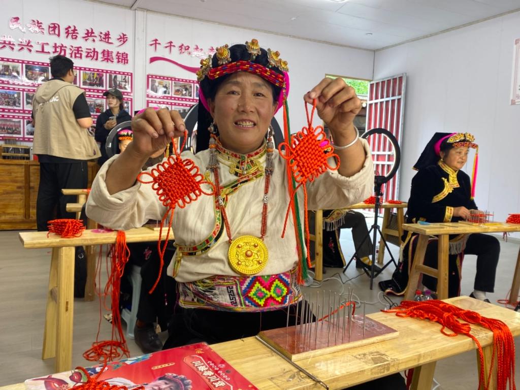 “金東—丹巴巾幗共興工坊”內(nèi),一位繡娘向記者展示剛編好的中國(guó)結(jié) 記者 周以航 攝