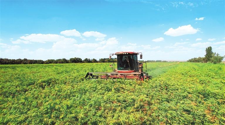 但見(jiàn)地里的苜蓿有高有低、呈波浪狀?!澳闱?,我們農(nóng)場(chǎng)進(jìn)行植株高低搭配,將個(gè)頭較高的WJ363HK苜蓿與個(gè)頭低的阿蒂娜間作套種,當(dāng)苜蓿大面積開(kāi)花時(shí),能充分享受陽(yáng)光,提高苜蓿牧草的粗蛋白含量?!壁w富強(qiáng)說(shuō)著算了一筆賬:今年6月10日到20日,頭茬苜蓿成熟,19臺(tái)大型機(jī)械搶趕時(shí)間,一個(gè)多星期就收割結(jié)束,保障了粗蛋白含量高達(dá)20%以上;目前第二茬苜蓿只有40厘米高,長(zhǎng)到7月下旬80厘米左右即可收割;第三茬苜蓿到9月中下旬時(shí)收割。1畝苜蓿收割3茬、可產(chǎn)900公斤至1噸干草,按照目前市場(chǎng)價(jià)1噸干草1600至1800元計(jì)算,收益可觀。