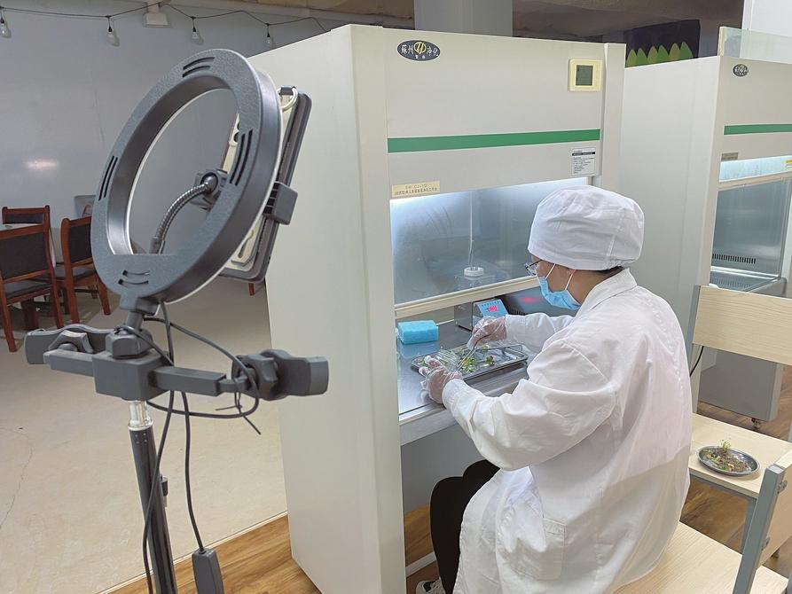 陽城縣町店鎮(zhèn)紅薯種植科技產(chǎn)業(yè)園直播基地里,技術(shù)員正在進(jìn)行紅薯苗脫毒速繁直播