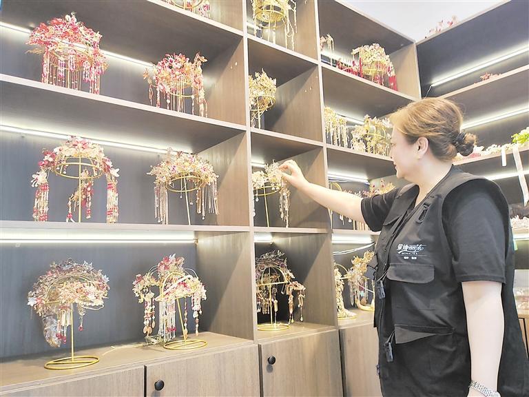 劉莎在影樓整理新娘頭飾