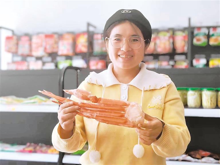 喜存英向記者展示在店鋪開張當(dāng)日非常走俏的產(chǎn)品蟹腿