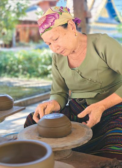 在景萊村的一處木亭里,63歲的玉相論正垂目凝神、轉(zhuǎn)動(dòng)拉坯轉(zhuǎn)輪,一個(gè)普通的陶坯在她手下逐漸變身為帶有壺嘴的陶罐。玉相論43歲才開(kāi)始學(xué)習(xí)傣族慢輪制陶技藝,現(xiàn)在她是西雙版納州級(jí)非遺傳承人。“把制陶的方法傳下去,也是把傣家人的生活方式傳下去?!庇裣嗾撜f(shuō)。