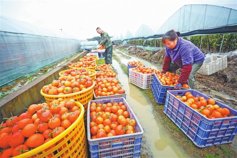 樂安縣山碭鎮(zhèn)流芳村西紅柿種植基地,村民正在搬運采摘好的西紅柿 通訊員 邱志超 攝