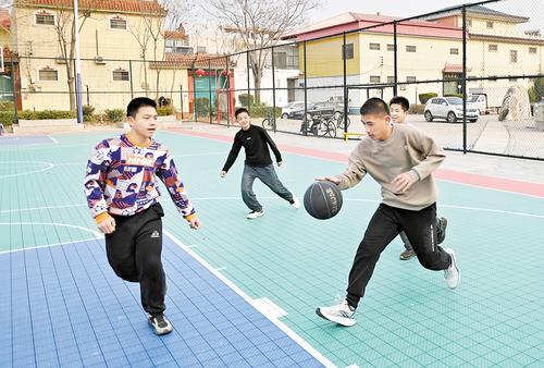 3月16日,寧晉縣黃兒營(yíng)西村青少年在村里的民樂(lè)廣場(chǎng)籃球場(chǎng)打籃球。記者 王偉宏 攝