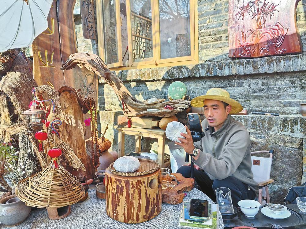 大乖來(lái)自陜西西安,是旅游愛(ài)好者。2022年,他通過(guò)網(wǎng)友介紹來(lái)到白云村,被這里“遠(yuǎn)上寒山石徑斜,白云生處有人家”的詩(shī)意景致吸引,便決定旅居于此。“這里不僅風(fēng)景如畫,還有茶葉、核桃、蜂蜜等土特產(chǎn)。我是主播,既然住下來(lái),就想幫村民通過(guò)直播增收?!贝蠊缘南敕ǖ玫酱濉皟晌钡闹С?。他與團(tuán)隊(duì)一起修繕村內(nèi)的“禪茶小院”,用于短視頻拍攝,又把老電站舊址改造成簡(jiǎn)易直播間,讓古樸的村莊刮起一場(chǎng)“電商風(fēng)暴”。