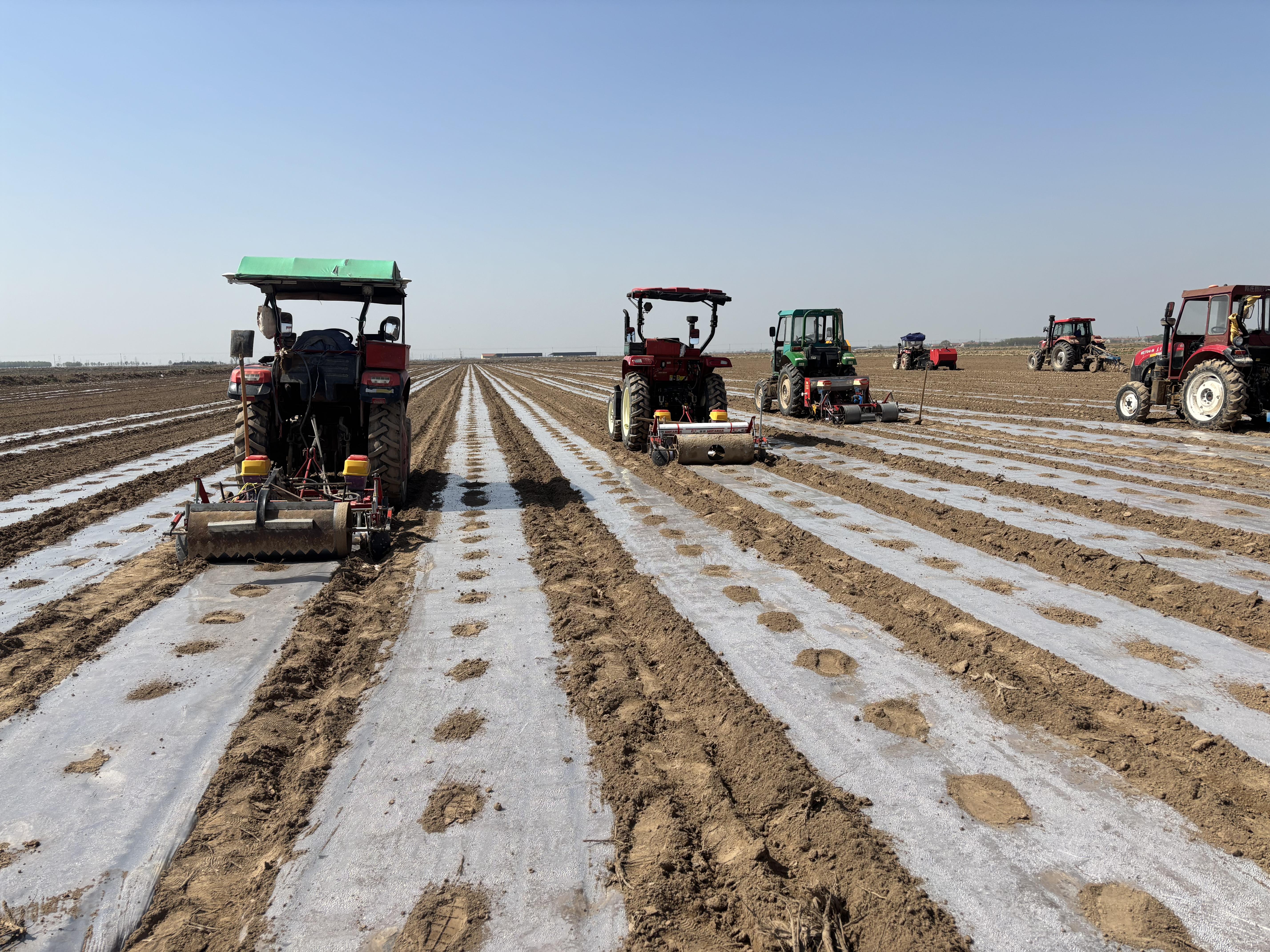 “黃河三角洲鹽堿地種棉需蓋地膜,傳統(tǒng)先播后蓋膜,待棉苗出土后人工放苗,不僅時(shí)間緊迫,且人工短缺嚴(yán)重制約機(jī)械化發(fā)展?!鄙綎|省農(nóng)業(yè)專家顧問團(tuán)棉花分團(tuán)團(tuán)長(zhǎng)董合忠介紹,新設(shè)備將播種、蓋膜、打孔三合一,優(yōu)化流程,從播種環(huán)節(jié)為棉苗生長(zhǎng)預(yù)留空間,為全程機(jī)械化作業(yè)奠定堅(jiān)實(shí)基礎(chǔ)。