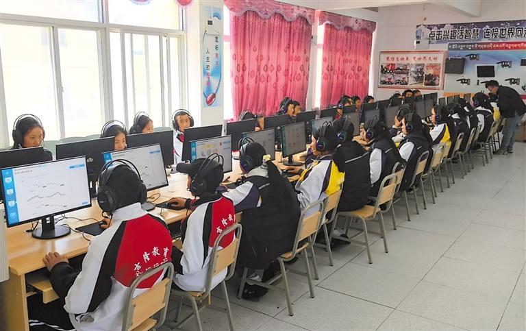 在日喀則市吉隆縣中學(xué)新機(jī)房?jī)?nèi),學(xué)生們頭戴耳機(jī)跟隨教師指令進(jìn)行實(shí)操訓(xùn)練。