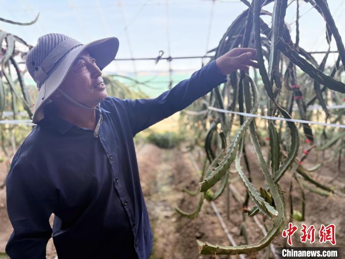 韓鳳正在打理日光溫室大棚里火龍果樹(shù)。記者 張瑋 攝