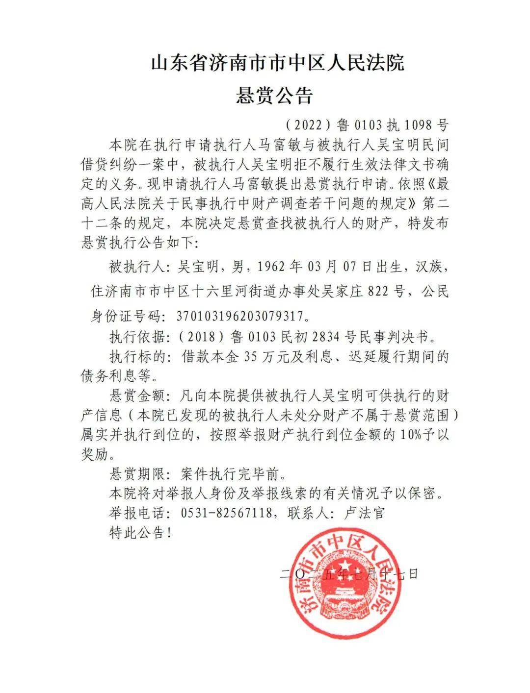 本院在執(zhí)行申請執(zhí)行人馬富敏與被執(zhí)行人吳寶明民間借貸糾紛一案中,被執(zhí)行人吳寶明拒不履行生效法律文書確定的義務(wù)。現(xiàn)申請執(zhí)行人馬富敏提出懸賞執(zhí)行申請。依照《最高人民法院關(guān)于民事執(zhí)行中財產(chǎn)調(diào)查若干問題的規(guī)定》第二十二條的規(guī)定,本院決定懸賞查找被執(zhí)行人的財產(chǎn),特發(fā)布懸賞執(zhí)行公告如下: