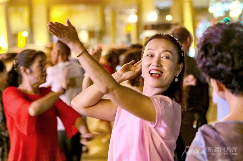 各族群眾在奇臺(tái)古城商業(yè)街旁的廣場(chǎng)上跳舞(7月4日攝)。記者 蔡增樂(lè) 攝