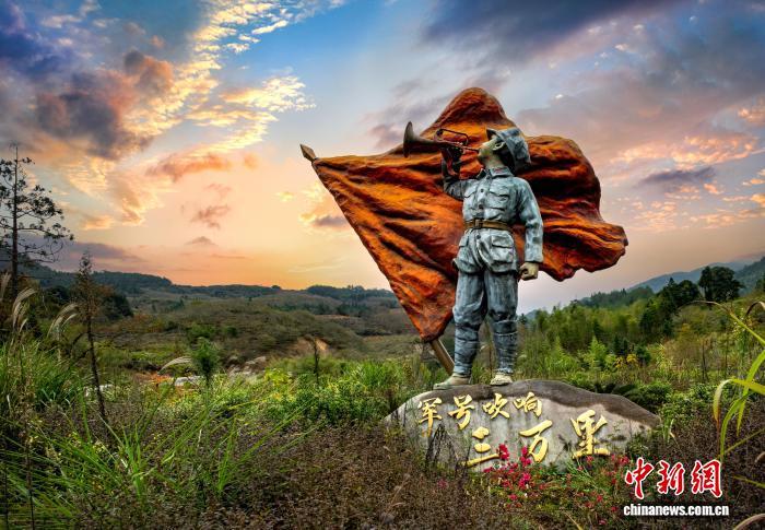 三萬里村的“軍號(hào)吹響三萬里”雕塑。(屏南縣路下鄉(xiāng)人民政府供圖)