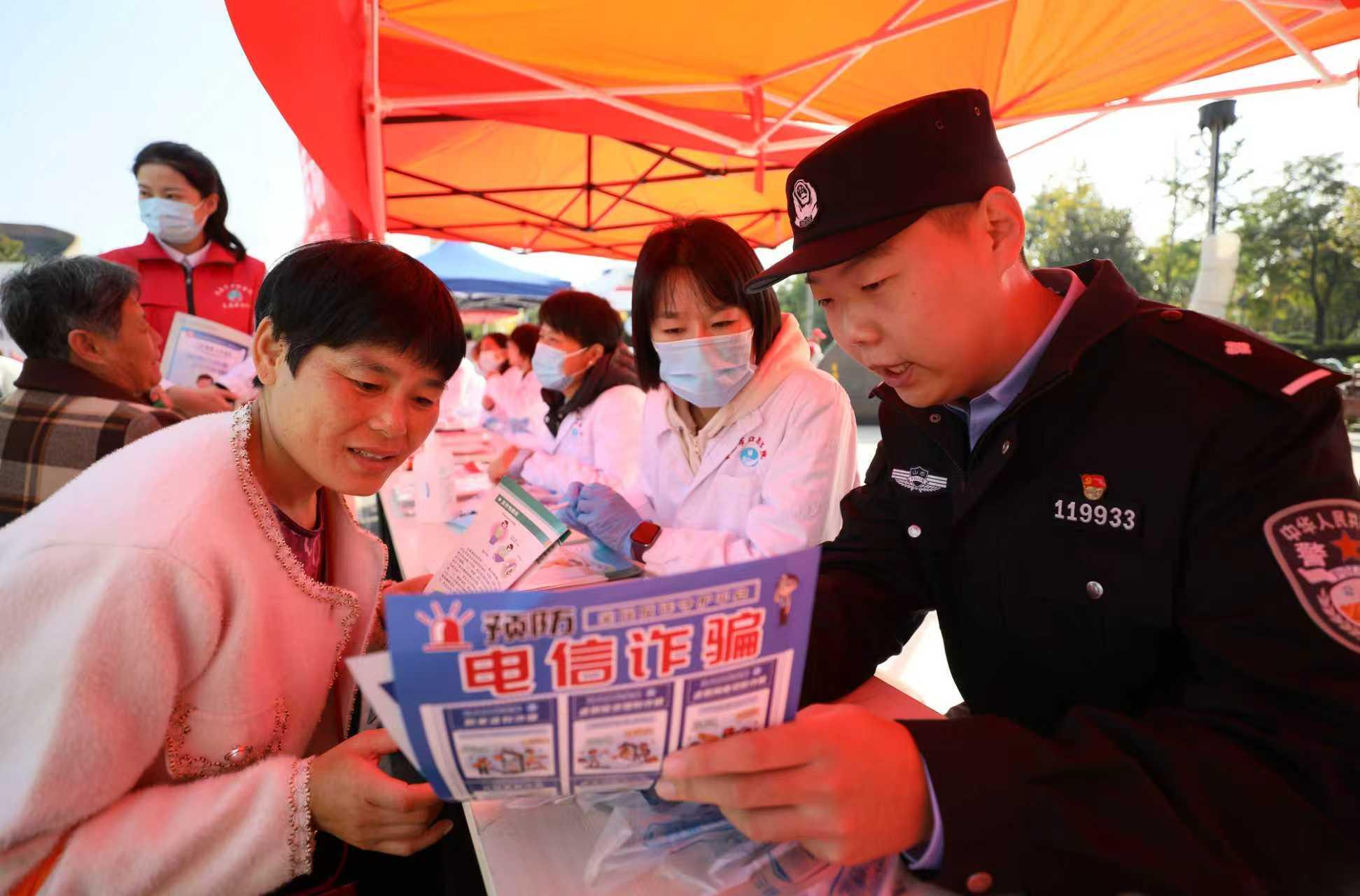 10月29日,在山東省棗莊市臺兒莊區(qū)興中廣場,民警在向前來義診的市民普及防范電信網(wǎng)絡(luò)詐騙知識。當日是農(nóng)歷九月初九,2025年棗莊市暨臺兒莊區(qū)“敬老月”重陽節(jié)健康義診活動在此舉行,在做好為廣大居民義診的同時,臺兒莊區(qū)衛(wèi)生健康局邀請臺兒莊公安分局反詐民警,向前來義診的市民發(fā)放防范電信網(wǎng)絡(luò)詐騙宣傳彩頁,普及相關(guān)知識,告訴大家在就醫(yī)就診過程中要切實提高電信網(wǎng)絡(luò)詐騙防范意識。(山東省棗莊市公安局臺兒莊分局 張嚴新)