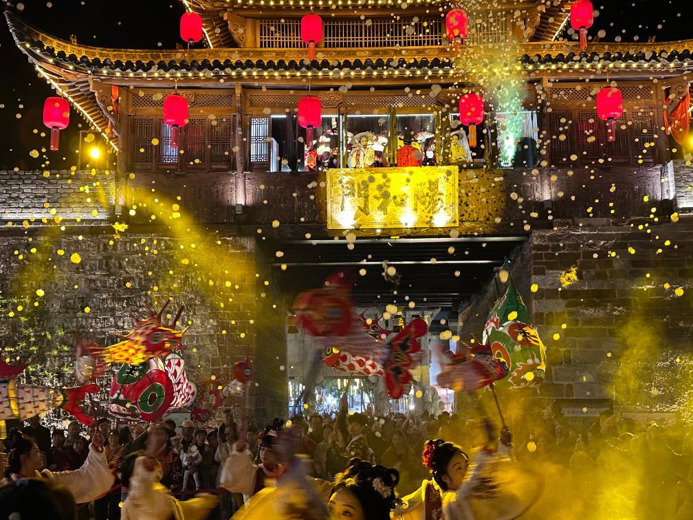夜色漸濃,安徽歙縣徽州古城陽和門上鼓聲乍起,一盞盞流光溢彩的魚燈應(yīng)聲游走,穿梭于黛瓦飛檐間。光影搖曳中,詩人筆下“鳳簫聲動,玉壺光轉(zhuǎn),一夜魚龍舞”的盛景在徽州大地復(fù)現(xiàn)。