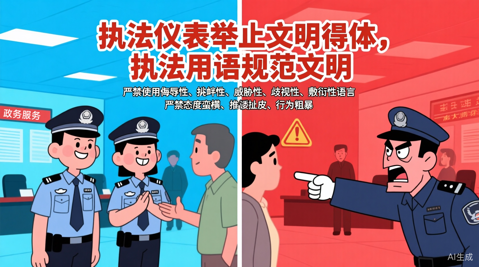 執(zhí)法儀表舉止文明得體,執(zhí)法用語規(guī)范文明,尊重當(dāng)事人和利害關(guān)系人。嚴(yán)禁使用侮辱性、挑釁性、威脅性、歧視性、敷衍性語言。嚴(yán)禁態(tài)度蠻橫、推諉扯皮、行為粗暴。