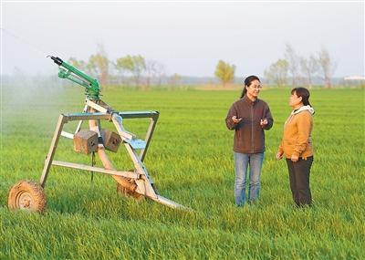 陳世君(左)為村民講解小麥科學(xué)灌溉的知識。陳雷 攝