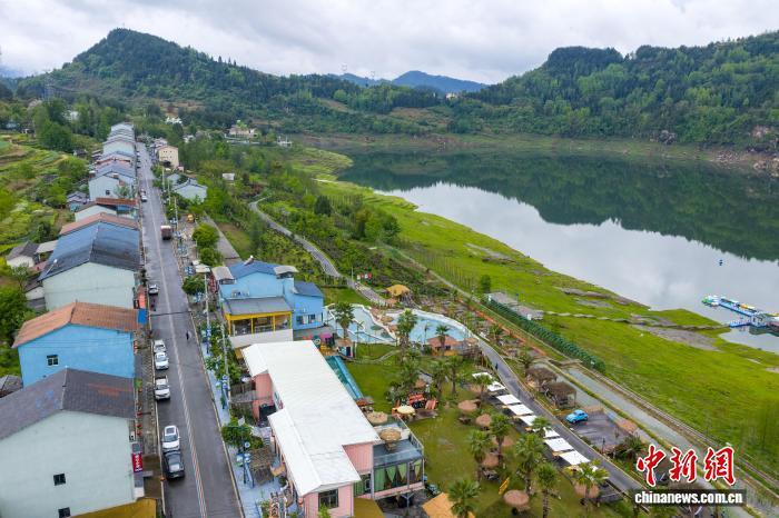 圖為重慶石柱橋頭鎮(zhèn)長沙村,一排排精品民宿立于湖光山色間。中新網(wǎng)記者 何蓬磊 攝