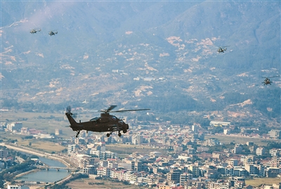 “計時起飛?!鄙衔?時,隨著塔臺指揮員一聲令下,30余架多型號直升機從閩南某機場騰空而起,直奔預(yù)定空域,拉開訓(xùn)練帷幕。