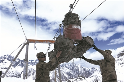 連隊(duì)通過索道將補(bǔ)給物資運(yùn)送到哨所。