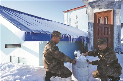上等兵呂勝超、林元就近取雪,準(zhǔn)備為戰(zhàn)友們燒洗臉?biāo)?/p>