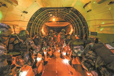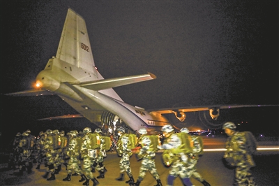 凌晨4時,數(shù)架滿載全副武裝傘兵的大型運輸機,依次騰空而起向預(yù)定空域機動。