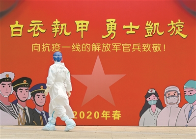 上圖:4月5日,在武漢泰康同濟醫(yī)院,護送一名新冠肺炎治愈患者出院后,軍隊支援湖北醫(yī)療隊隊員葉洪江從院區(qū)內(nèi)的展板前走過返回病房。