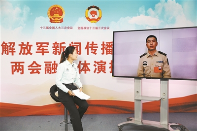 本報(bào)記者張笑語通過視頻連線方式采訪軍隊(duì)人大代表尹東。蘇鶴 攝