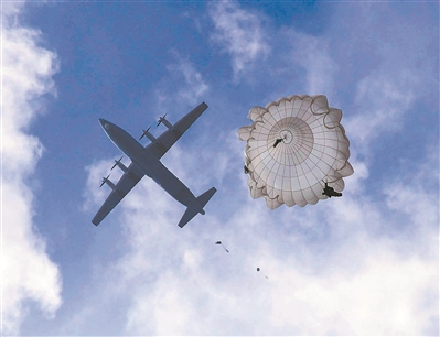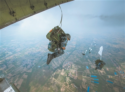 上午8時許,滿載傘兵的運輸機(jī)騰空而起。到達(dá)預(yù)定空域后,傘兵們聽從投放員口令,成雙路隊形依次躍出機(jī)艙。瞬時,朵朵傘花綻放于藍(lán)天。