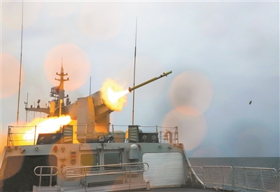 “開火!”指揮員下達(dá)作戰(zhàn)命令。黃石艦上,防空導(dǎo)彈拖著紅色尾焰呼嘯而出,直撲“敵”機(jī)。信陽艦上,主炮噴吐烈焰,對“敵”艦實(shí)施有效火力打擊……