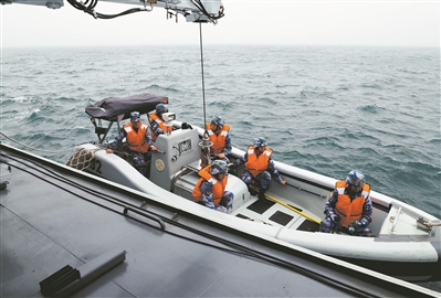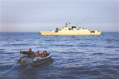 圖④:信陽艦吊放小艇展開訓(xùn)練。