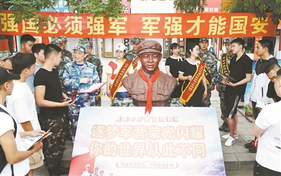 七月下旬,遼寧省遼陽市弓長嶺區(qū)人武部開展“逐夢軍營、榮光閃耀”主題征兵宣傳活動?;顒蝇F(xiàn)場,現(xiàn)役軍官、雷鋒宣講團成員等征兵宣傳員在雷鋒塑像前為適齡青年就參軍入伍相關(guān)問題進行解答。譚長俊攝