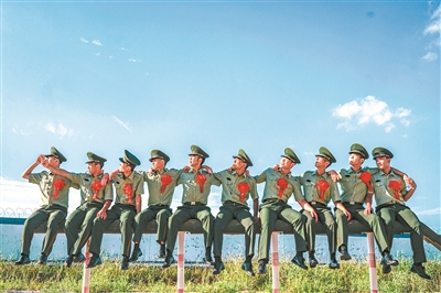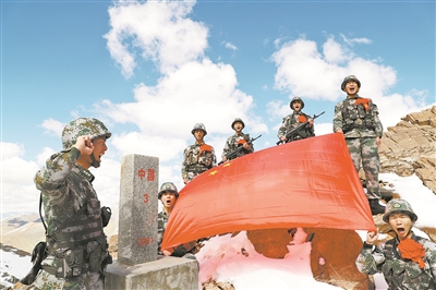 圖①:新疆軍區(qū)某邊防團(tuán)退伍老兵在界碑前重溫軍人誓詞。