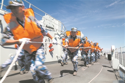 演訓(xùn)不避險,緊貼實(shí)戰(zhàn)練。幾天時間里,編隊訓(xùn)練全程融入戰(zhàn)術(shù)背景,立足實(shí)戰(zhàn)需要,先后完成主炮對海射擊、副炮對空射擊、實(shí)射火箭深彈、編隊航行補(bǔ)給占位、營救落水人員等20多個課目訓(xùn)練。