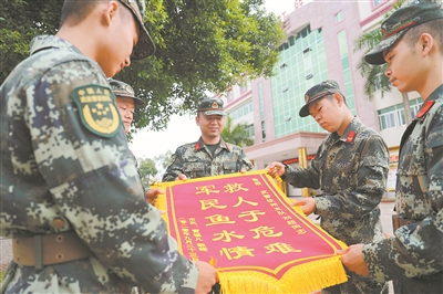 10月27日上午,病愈出院的雷鎮(zhèn)凡和家人帶著“軍民魚水情,救人于危難”的錦旗和一封感謝信來到武警廣西總隊欽州支隊。終于和尋找已久的恩人見面,老人緊緊地握住劉超的手,激動地說:“感謝你救了我,感謝部隊培養(yǎng)出這么優(yōu)秀的軍官。”
