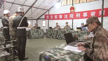 風(fēng)雨中,戰(zhàn)時(shí)自傷案件的軍事刑事審判正在野戰(zhàn)帳篷中緊張進(jìn)行,控辯雙方激烈交鋒。突然,一陣空襲警報(bào)響起,戰(zhàn)時(shí)審判庭馬上臨時(shí)休庭,全體人員緊急疏散隱蔽。