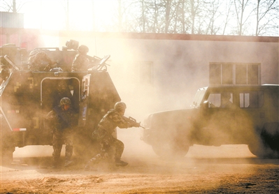 導(dǎo)調(diào)組下達(dá)“敵情”通報(bào):“‘暴恐分子’駕駛一輛越野車企圖沖擊我執(zhí)勤卡點(diǎn),迅速對其實(shí)施攔阻……”特戰(zhàn)隊(duì)員搭乘防暴裝甲車前去處置,途中遇到“暴恐分子”駕車加速沖來。在距離不足兩米遠(yuǎn)的地方,裝甲車駕駛員猛地轉(zhuǎn)向、剎車,橫擋在越野車前方將其截停。官兵隨即沖下車,將“暴恐分子”一舉抓獲。